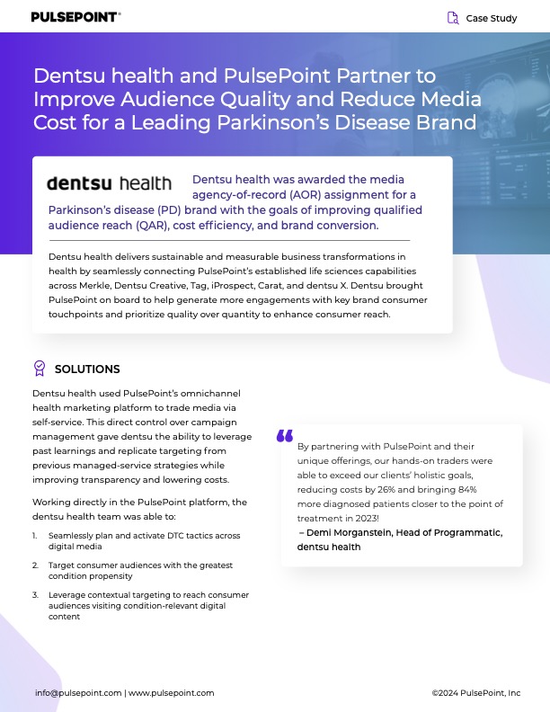As the agency of record for a Parkinson’s disease brand, Dentsu Health needed to reach the right consumers with their message while improving qualified audience reach (QAR), cost efficiency, and brand conversion. Using PulsePoint’s omnichannel health marketing platform, Dentsu was able to find their target audience and generate more engagement, all while decreasing campaign costs and increasing brand conversions.